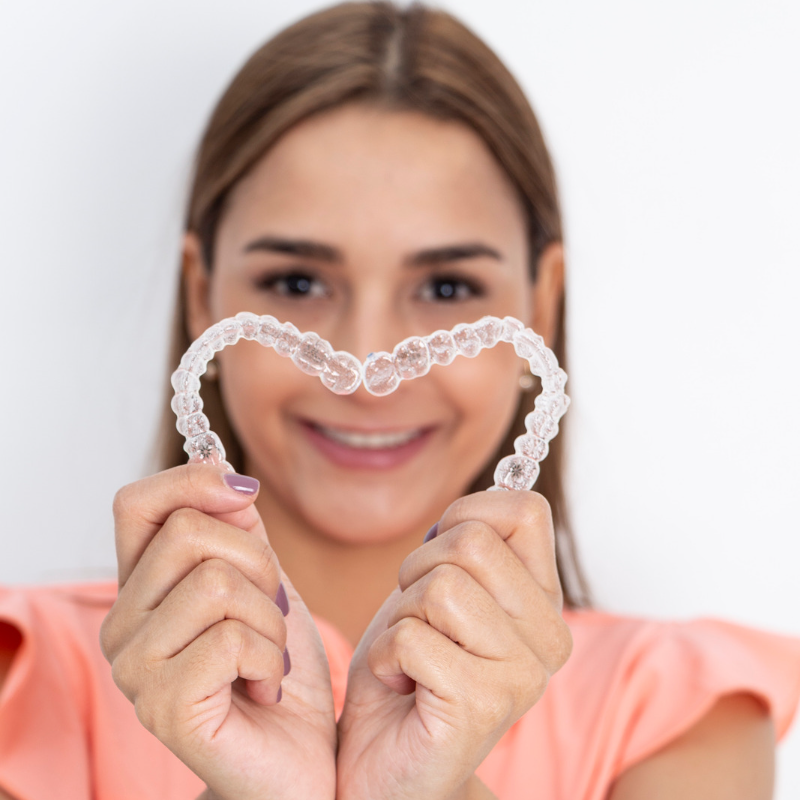 Treatment with Invisalign consists of wearing clear, removable aligners to move your teeth gradually over time. Invisalign works in the same way as traditional braces, but without the restriction of crunchy, chewy, sticky and sugar food, as the aligners must be removed before eating. What’s more, because they are nearly invisible, the aligners aren’t as noticeable as metal wires and brackets on other types of braces.
